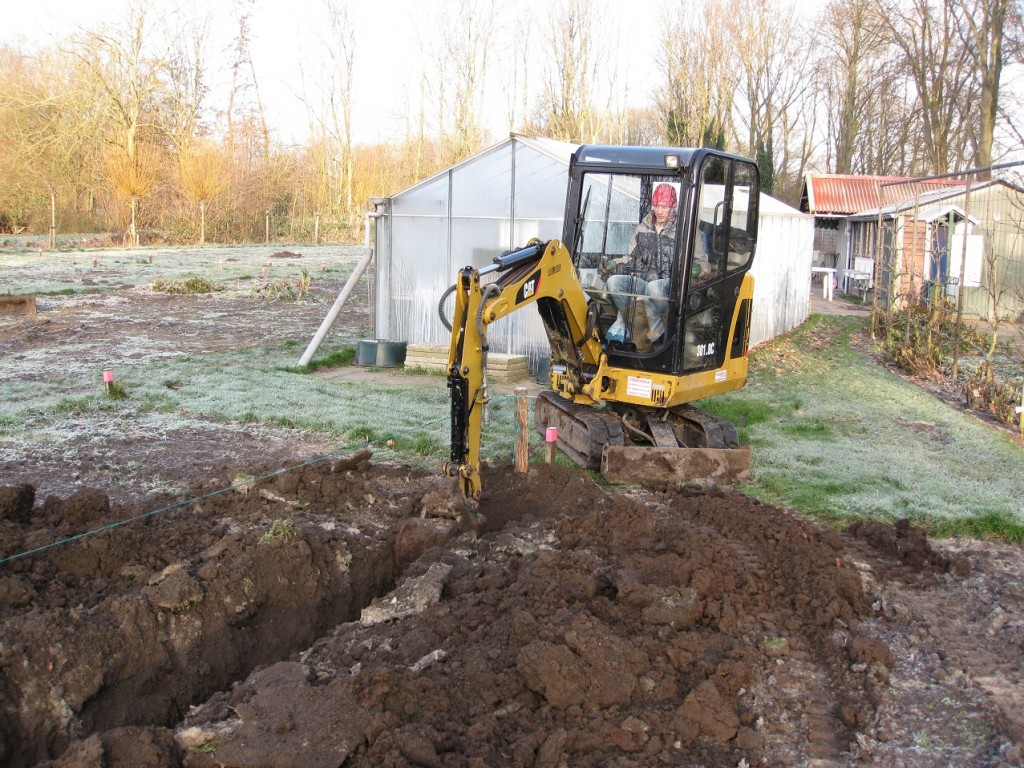 En dat was drainagebuizen aanleggen: lange slangen met kleine gaatjes, zo’n 50 cm diep in de grond, waardoor het water afgevoerd kon worden naar de sloot.