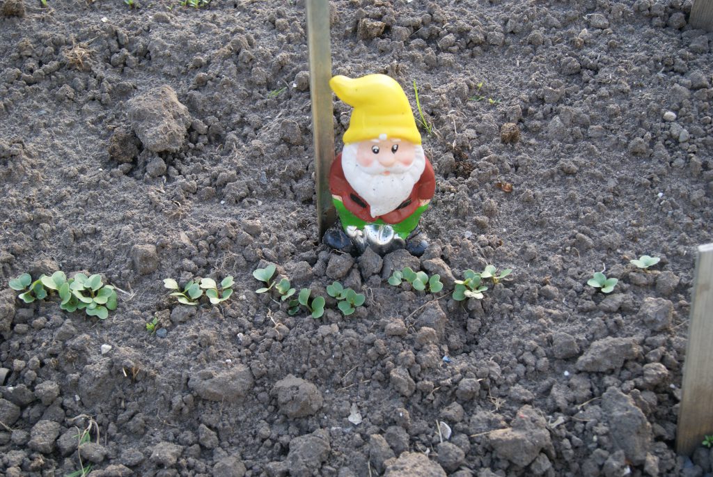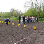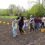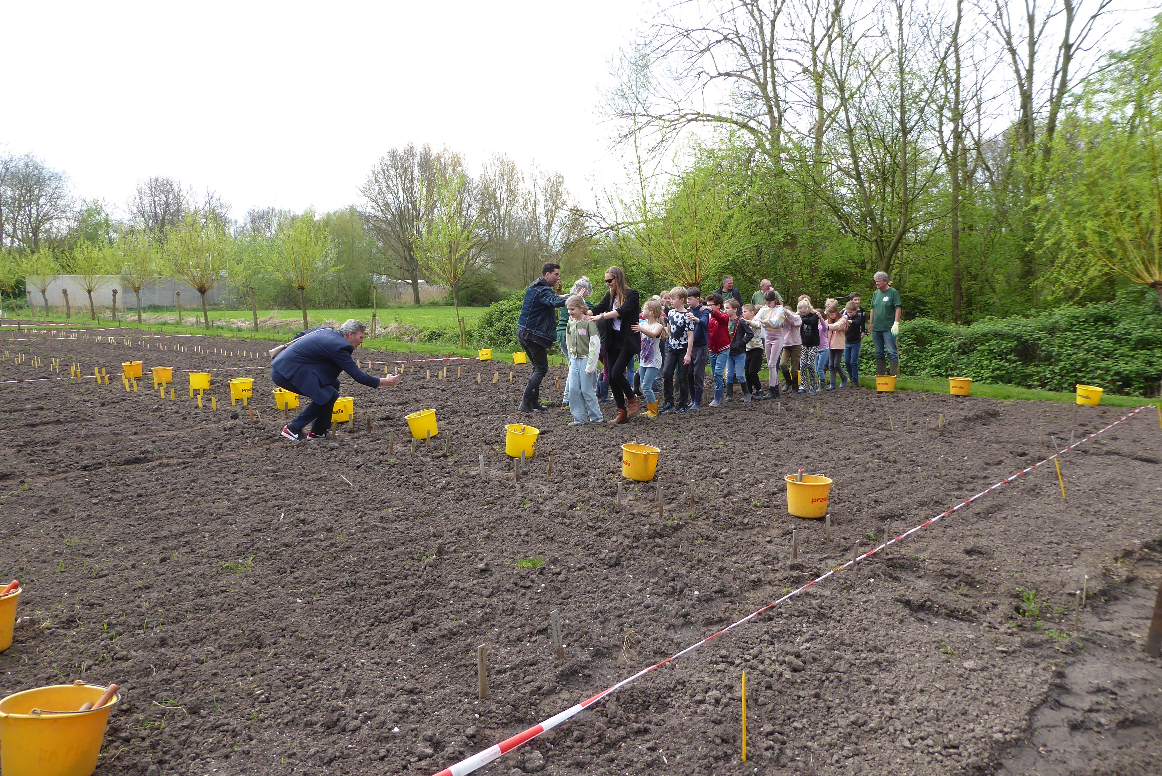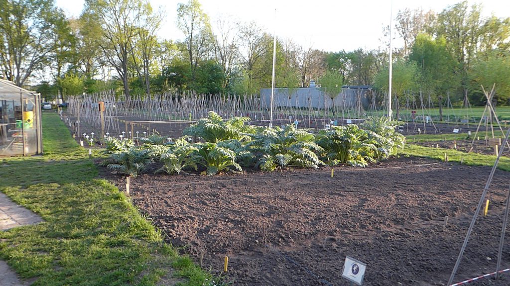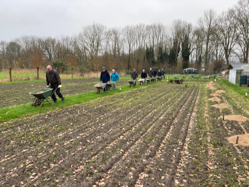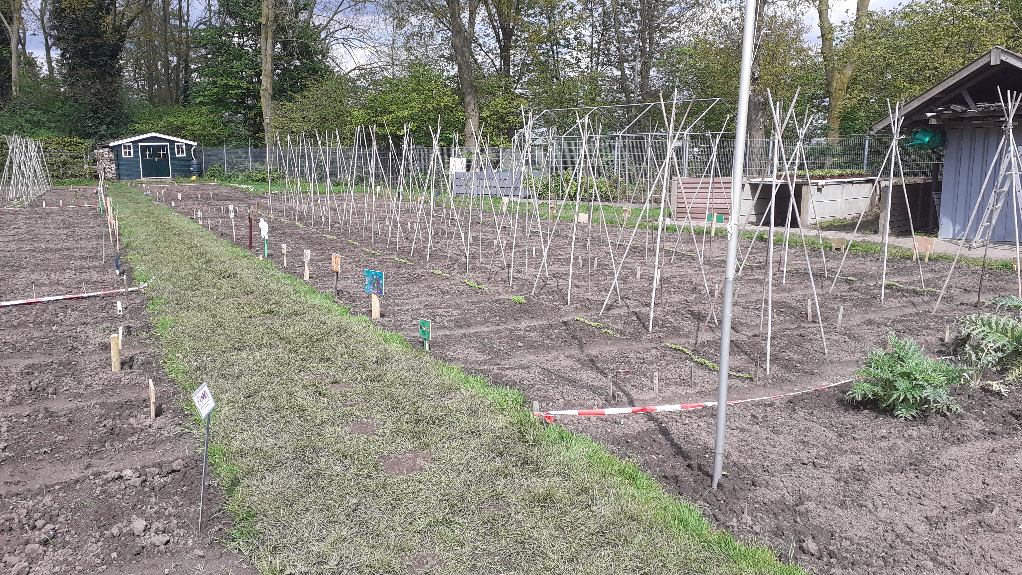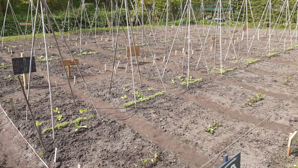4 april, een prachtige, droge, zonnige lentedag. Dat droge werkt wel een beetje tegen als we kijken naar alles wat gezaaid is. Gelukkig zijn de vrijwilligers druk bezig met gieters om de zaailingen water te geven.