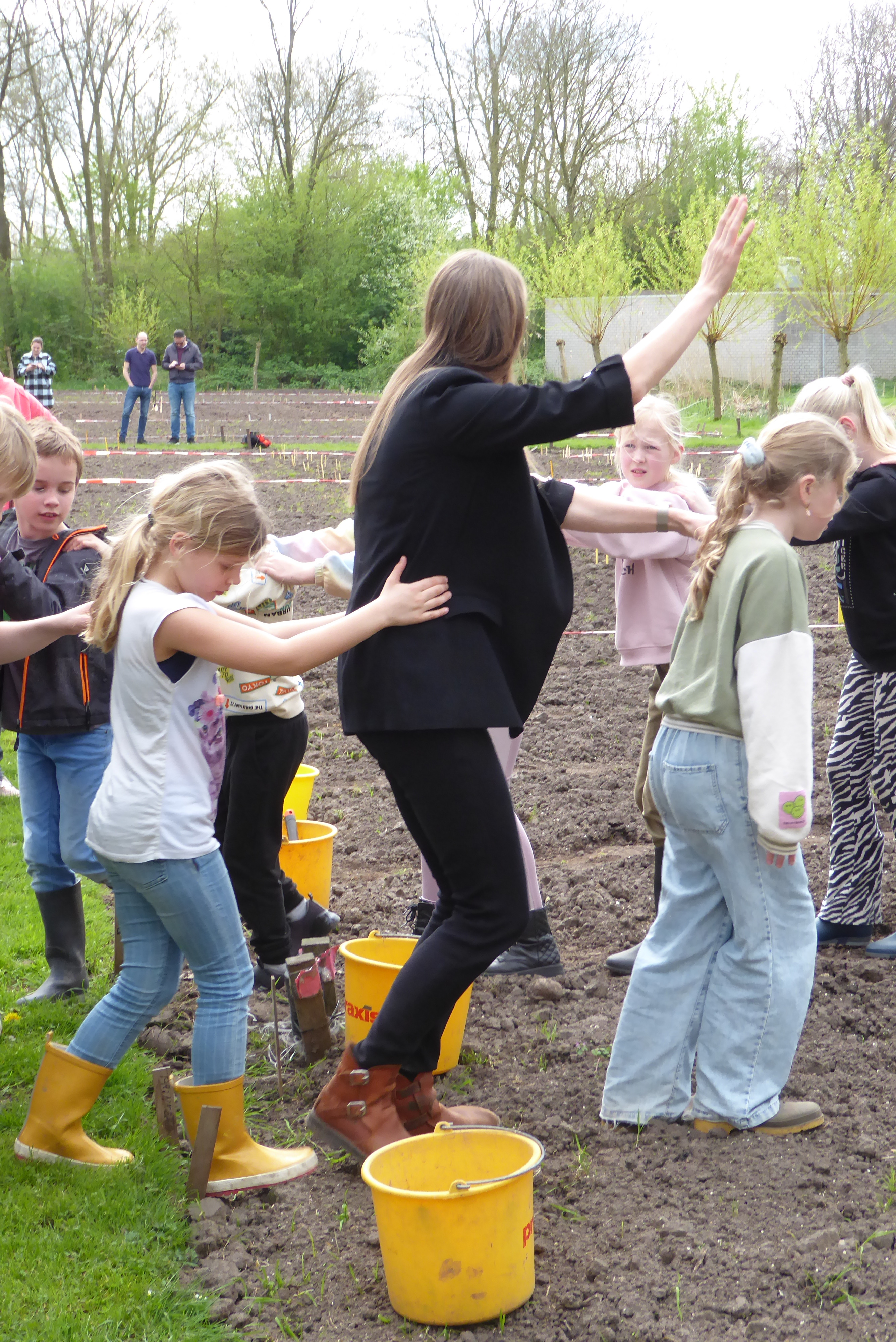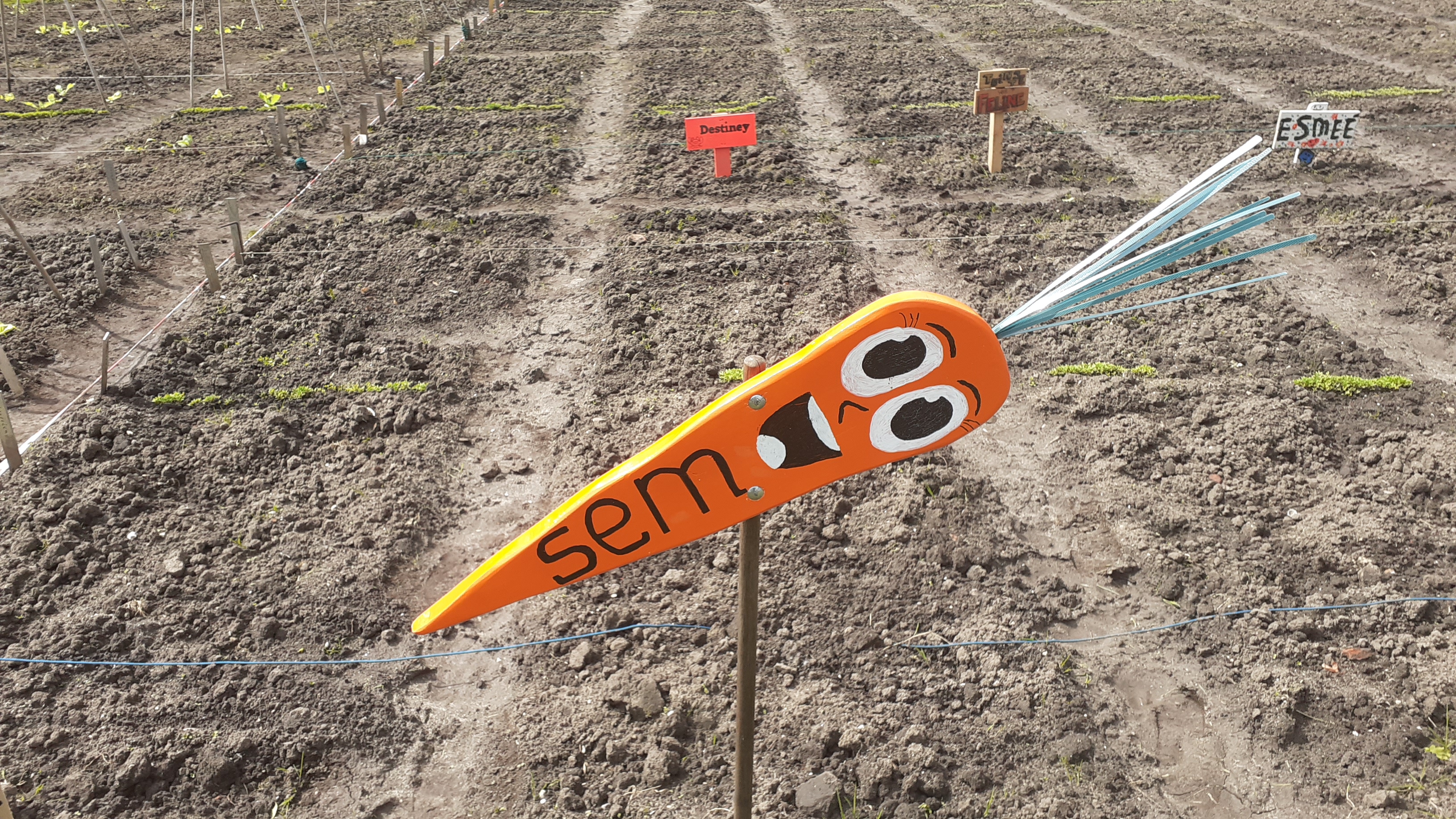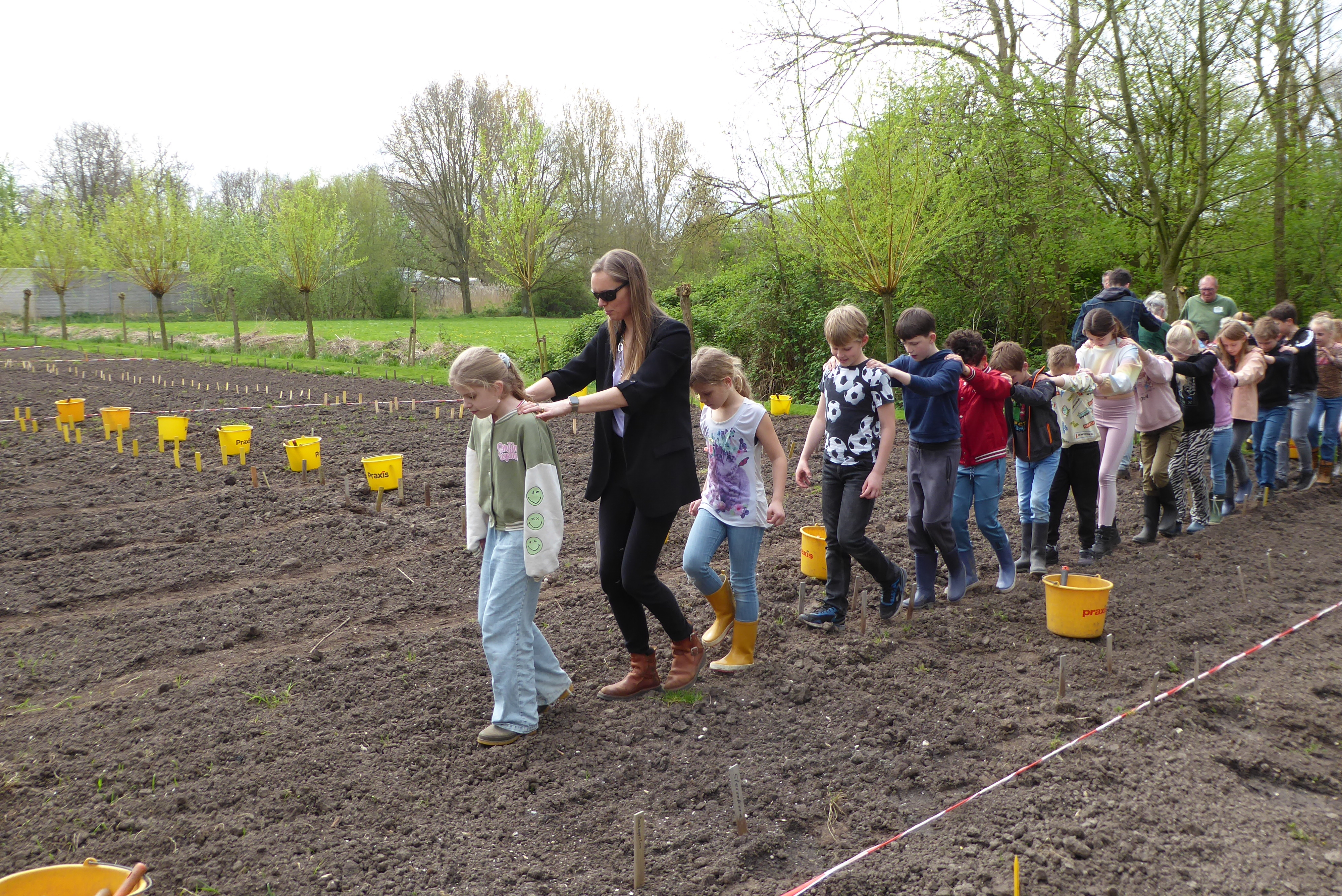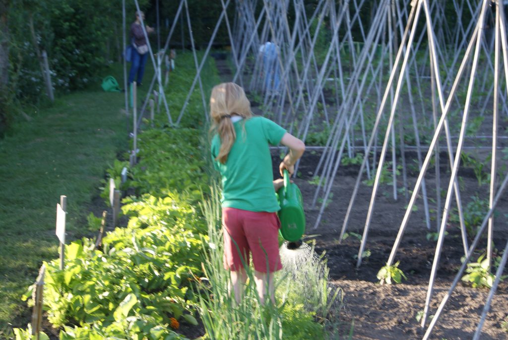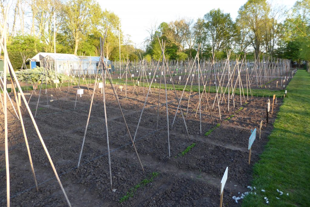 4 april, een prachtige, droge, zonnige lentedag. Dat droge werkt wel een beetje tegen als we kijken naar alles wat gezaaid is. Gelukkig zijn de vrijwilligers druk bezig met gieters om de zaailingen water te geven.