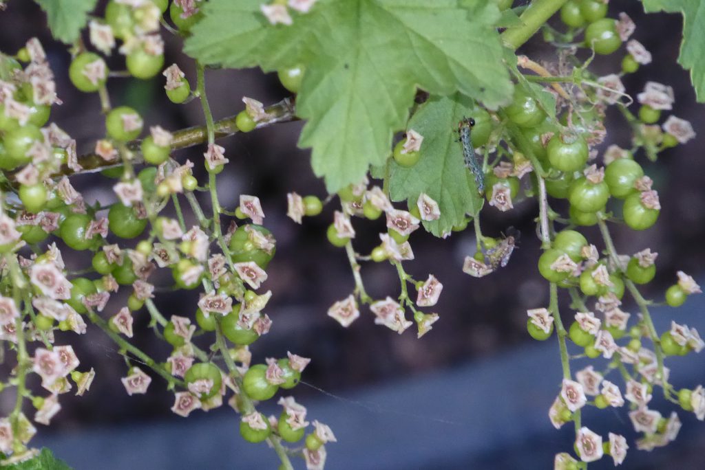 Als je goed kijkt naar de foto van de aalbessen zie je een blauwe rups
